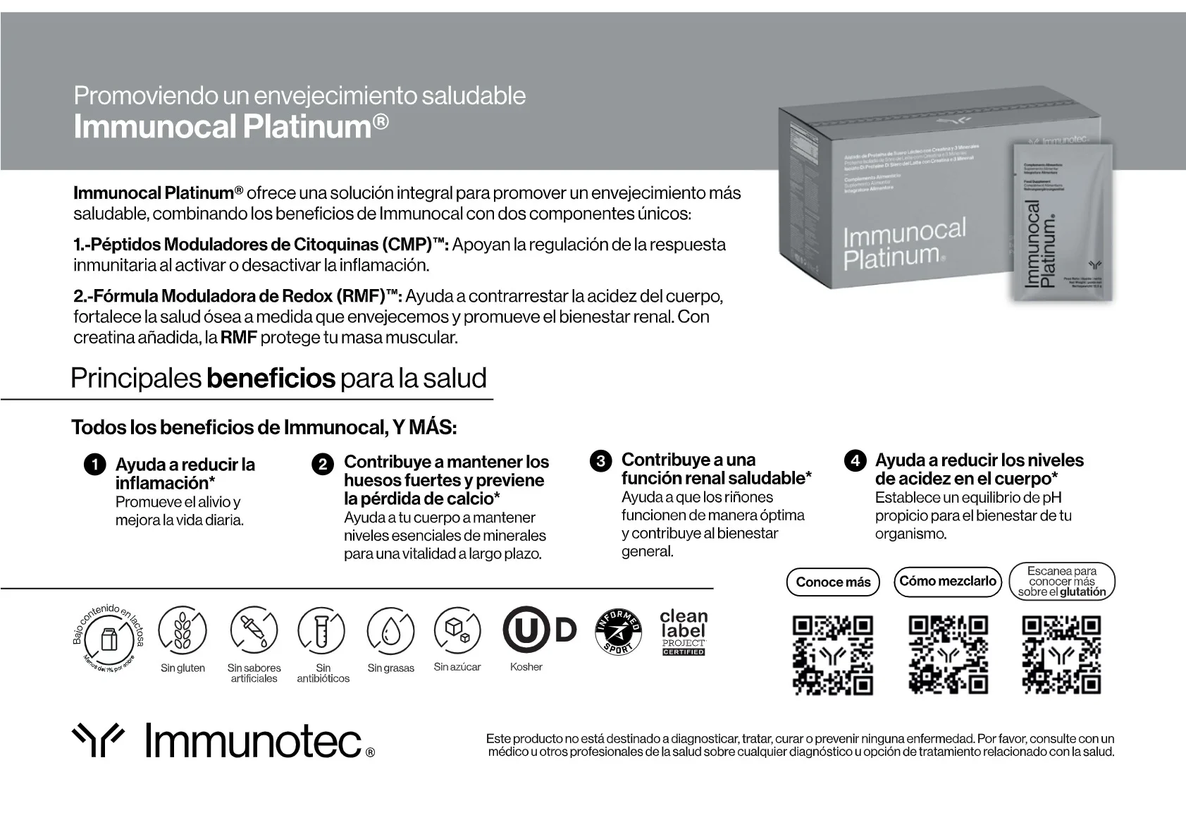 Immunocal es el producto central dentro de la línea de suplementación. Su formulación está orientada a favorecer la producción de glutatión, una molécula clave en la protección celular y el funcionamiento del sistema inmunológico.